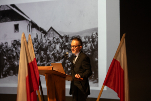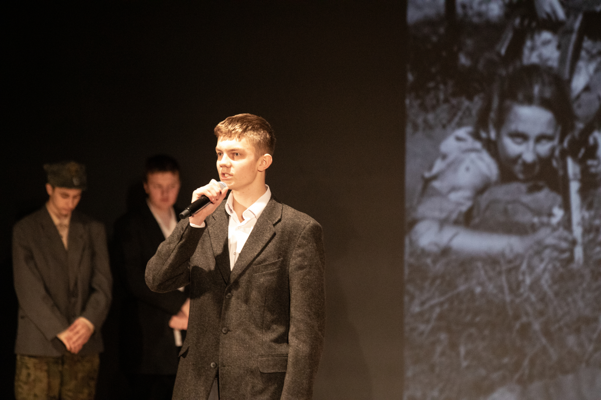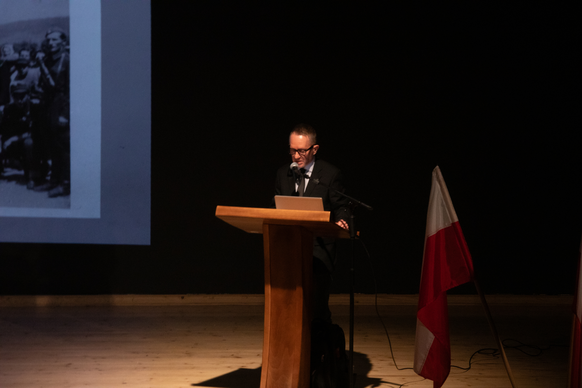 Następnie uczestnicy wydarzenia udali się do sali widowiskowej Gminnego Ośrodka Kultury w Nawojowej, gdzie odbyło się spotkanie o charakterze refleksyjno-patriotycznym przygotowane przez uczniów Szkoły Podstawowej im. bł. Julii Rodzińskiej w Nawojowej. Po programie artystycznym wykład historyczny wygłosił dr Marcin Kasprzycki z Instytutu Pamięci Narodowej Oddział w Krakowie, autor licznych badań dotyczących podziemia niepodległościowego na Sądecczyźnie.