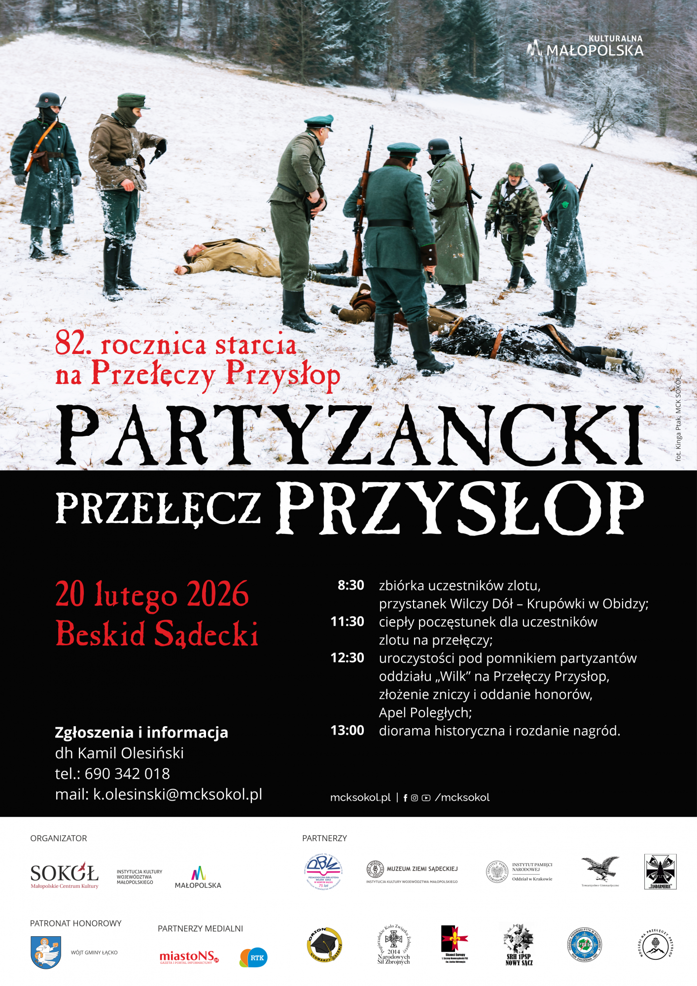 Małopolskie Centrum Kultury SOKÓŁ zaprasza na zlot upamiętniający poległych partyzantów Armii Krajowej z oddziału „Wilk”. Wydarzenie odbędzie się w czwartek, 20 lutego 2026 r., na Przełęczy Przysłop w Paśmie Radziejowej Beskidu Sądeckiego, w 82. rocznicę starcia na tym szlaku.